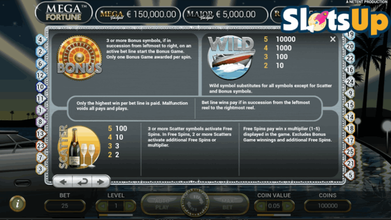 A Mega Fortune egy egyszerű játék, nincs szükséged semmilyen egyedi technikára ahhoz, hogy megnyerd. A játék számos szimbólumot tartalmaz, köztük a szokásos királyi szimbólumokat: A, K, Q és J. További magas nyereményt hozó szimbólumok a mandzsettagombok, dollárszámlák, konyakos italok, szivarok és luxusórák. Ha elég szerencsés vagy ahhoz, hogy 5 darab limuzint, a legmagasabb kifizető szimbólumot kapd, akár 40-szeres tétet is nyerhetsz. A játékot online játszva megismerkedhetsz a játékkal. Vannak ingyenes online nyerőgépek, amelyekkel játszhatsz, hogy megértsd, hogyan működik a játék. Ezután már valódi pénzért játszhatsz az online nyerőgépen.