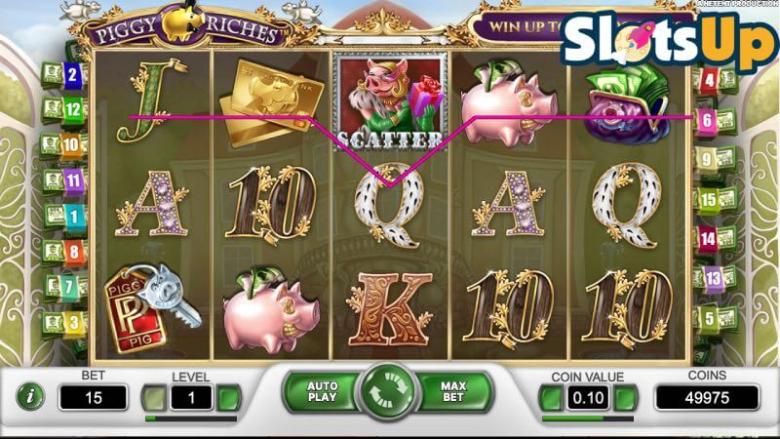 Most wins (77.43%) will occur in its base game, while 18.95% of RTP wins come from free spins. It's a medium variance game with a hit frequency rate of 34.11%, which means you will land a winning combination in over a third of spins. Piggy Riches casino game further presents a diverse range of wagering options, with coin values starting as low as €0.01 and reaching up to €0.50. Players can activate up to 15 paylines, with ten different betting levels to select from.
