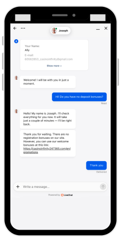 Szeretném megjegyezni, hogy az Infinity online kaszinó értékelésének előző verziójában a támogatási szolgáltatás értékelése kétszer olyan alacsony volt, és a kaszinónak javítási javaslatokat tettünk. Ma már jelentős javulást látok az ügyfélszolgálatuk minőségében, ami az általános értékelésre is pozitívan hatott.